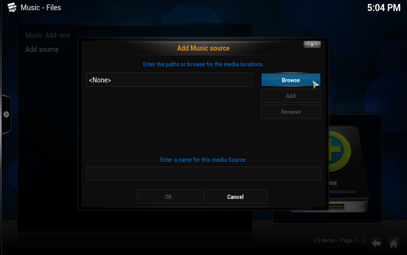 3. Click 'Browse' to browse the music sources available to XBMC