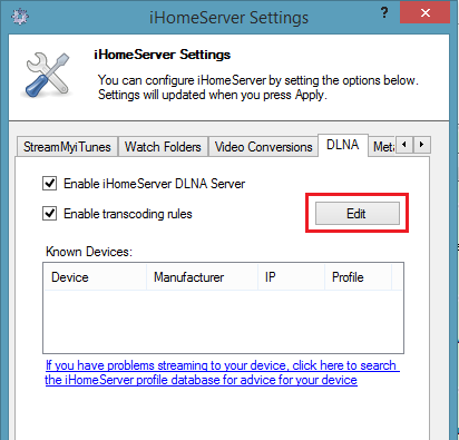 Transcoding Rules are configured by clicking the 'Edit' button next to 'Enable Transcoding Rules' within either the Network or DLNA tab of the iHomeServer Settings window: