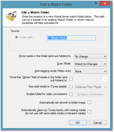 Watch Folder tab of the iHomeServer Management Console. Select the Watch Folder at the top (or "root") level of the 'Watch Folder' tab and click the 'Edit' button from the toolbar. The following dialog will be displayed: