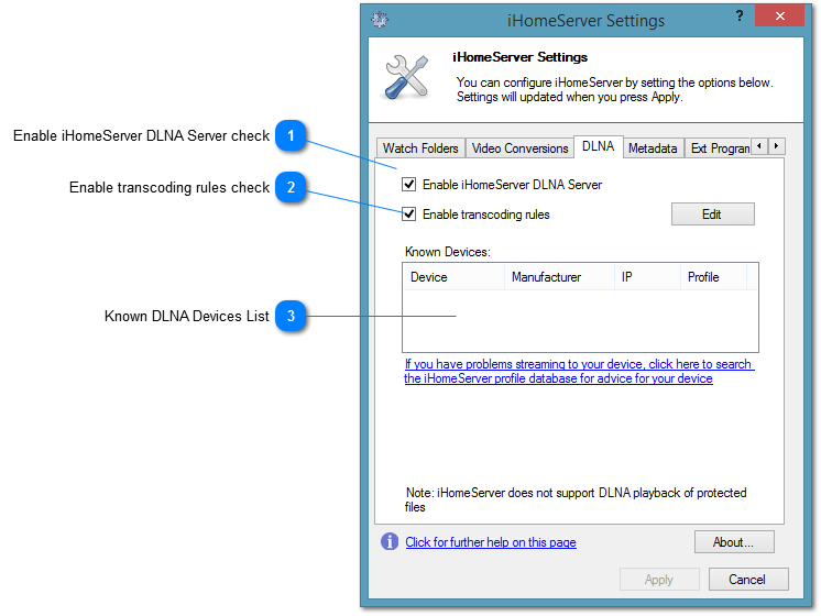 The DLNA Tab of iHomeServer Settings allows you to enable/disable the DLNA server feature within iHomeServer as well as view known DLNA rendering devices and configure DLNA transcoding rules.