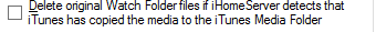 If you have set the iTunes preference "Copy files to iTunes Media folder when adding to library", then iTunes will make a copy of any file that iHomeServer detects in a Watch Folder into your iTunes Media folder. If you wish to automatically delete the original files (i.e. those in the Watch Folder) after iTunes has moved the file to the iTunes Media folder, then check this option. The default is unchecked.